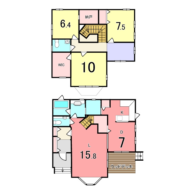 ウッドデッキや出窓が暮らしに温かみを添え、駐車は2台まで可能。